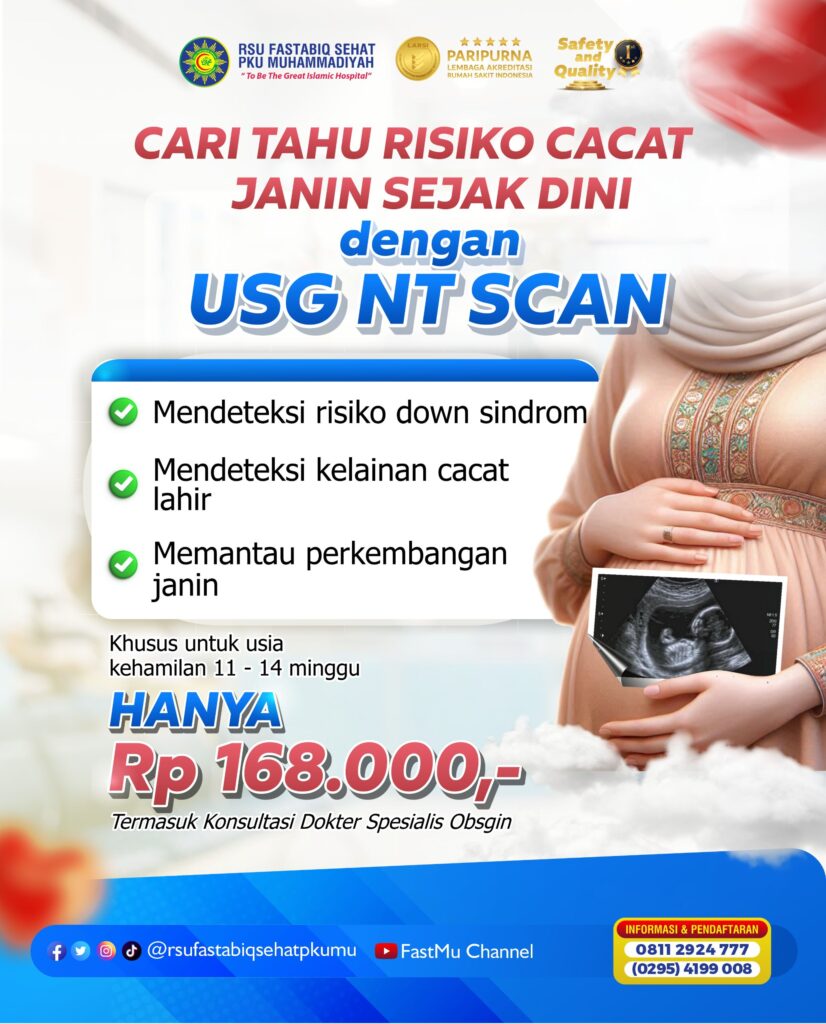Kesehatan janin adalah prioritas utama setiap ibu hamil. RSU Fastabiq Sehat PKU Muhammadiyah Pati menghadirkan layanan USG NT Scan (Nuchal Translucency Scan) — pemeriksaan ultrasonografi khusus trimester pertama yang dirancang untuk mendeteksi risiko kelainan kromosom dan cacat bawaan pada janin sedini mungkin.